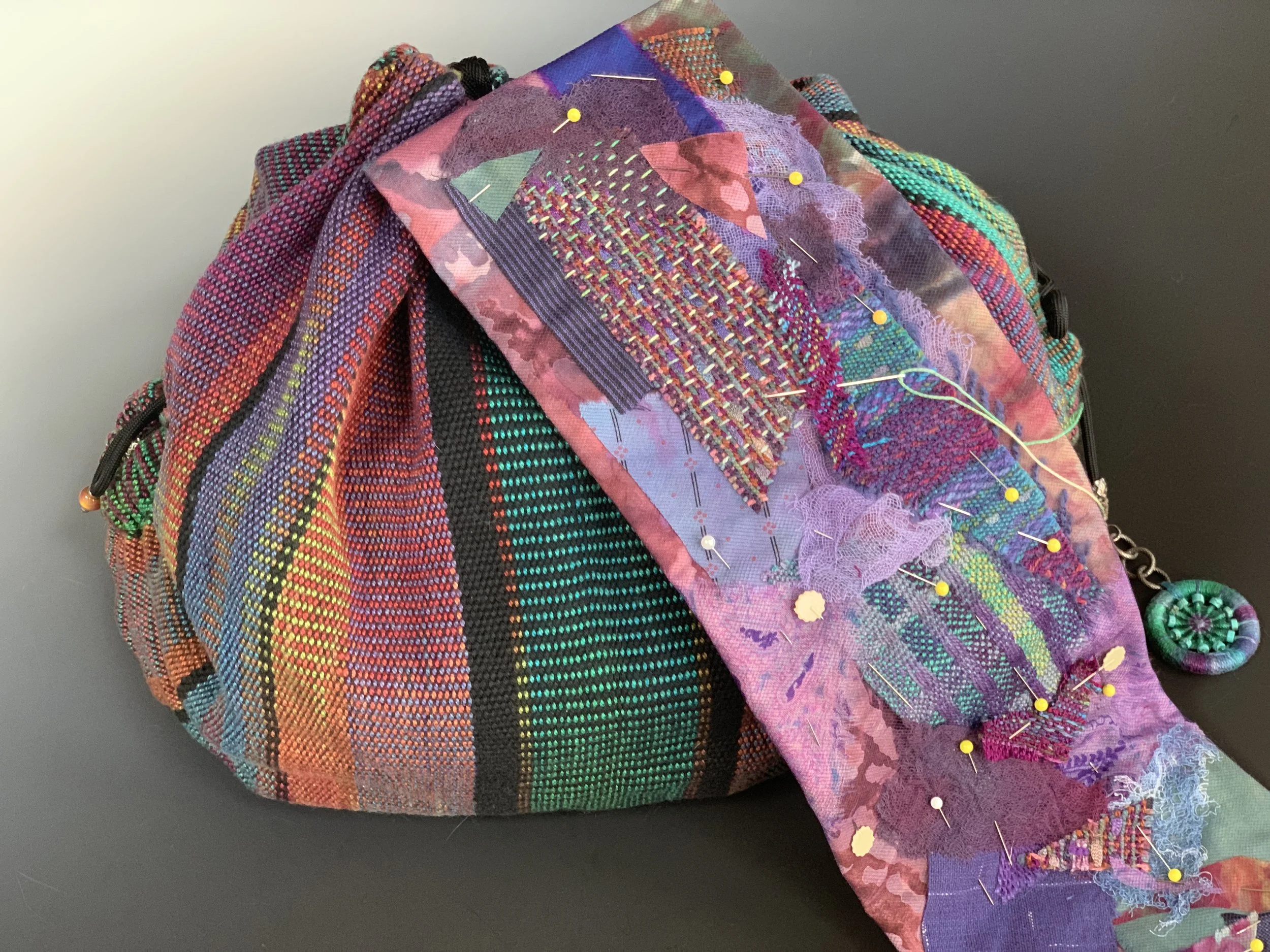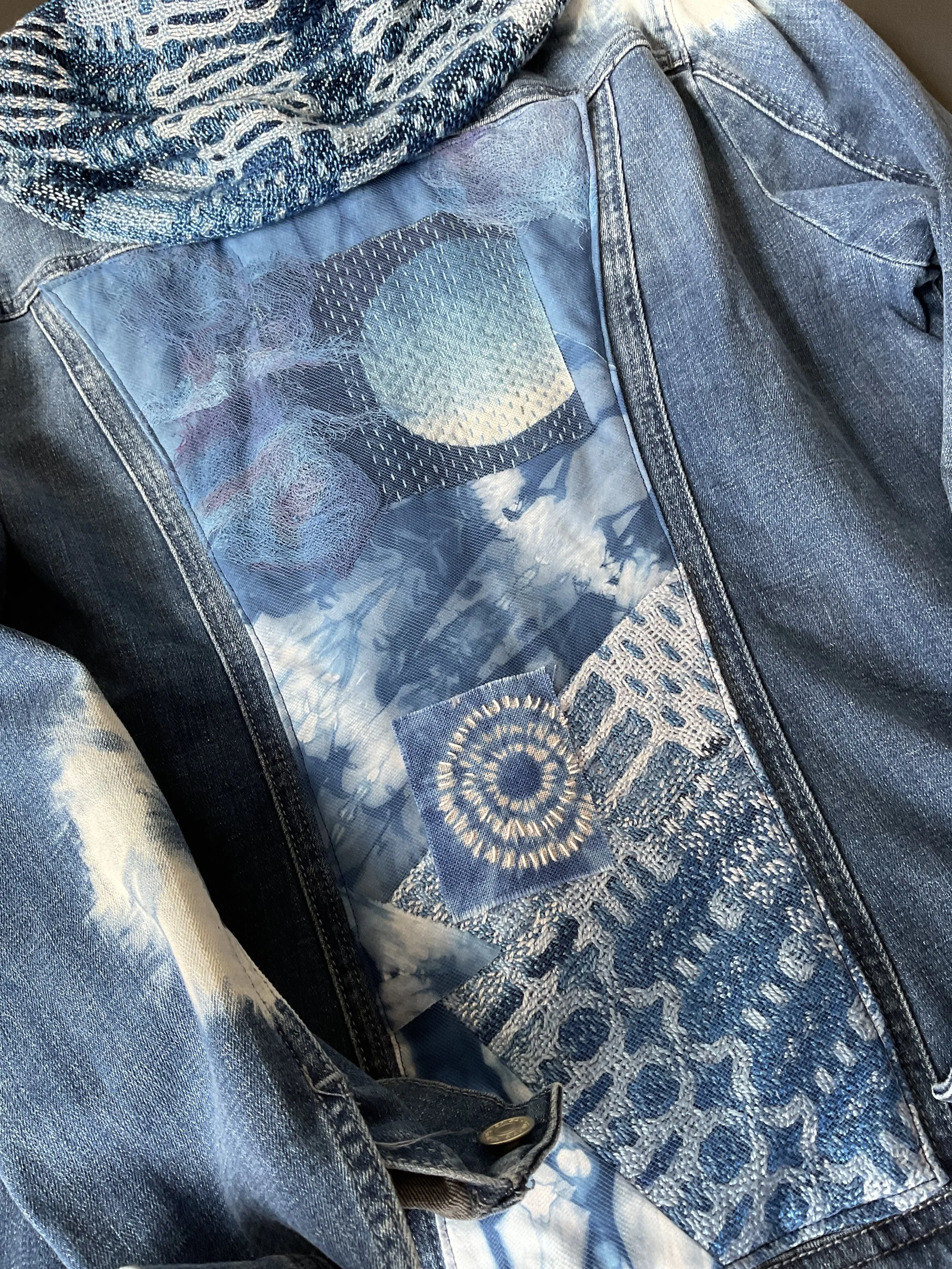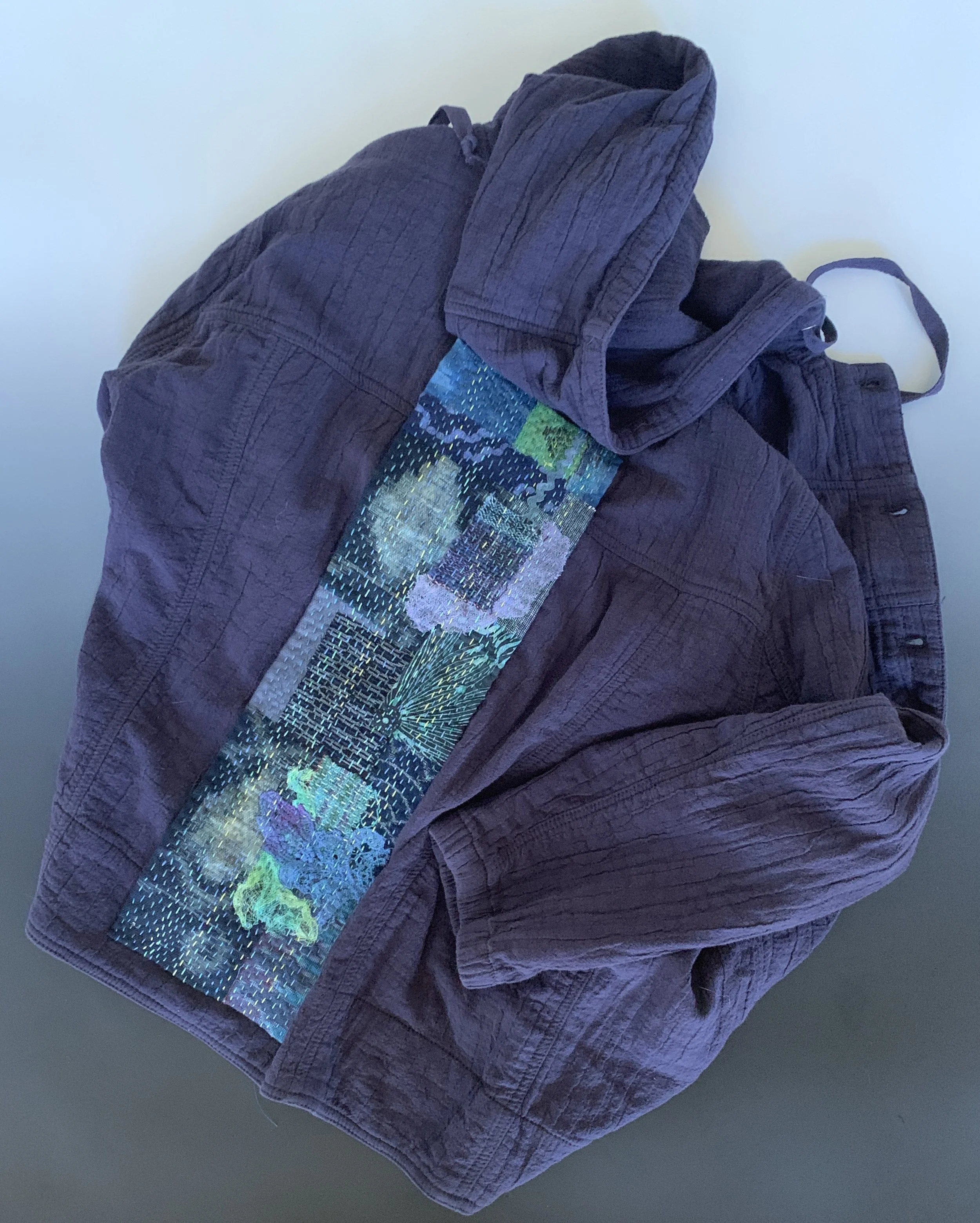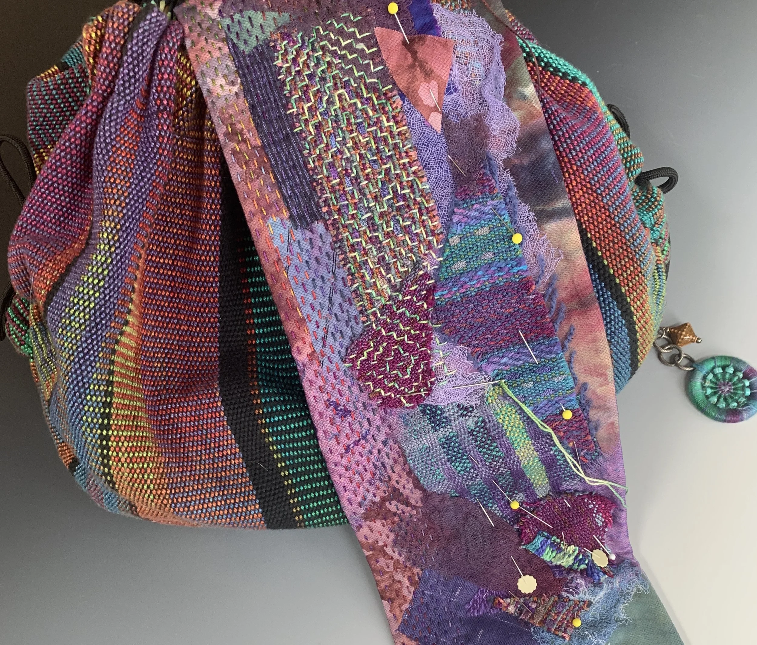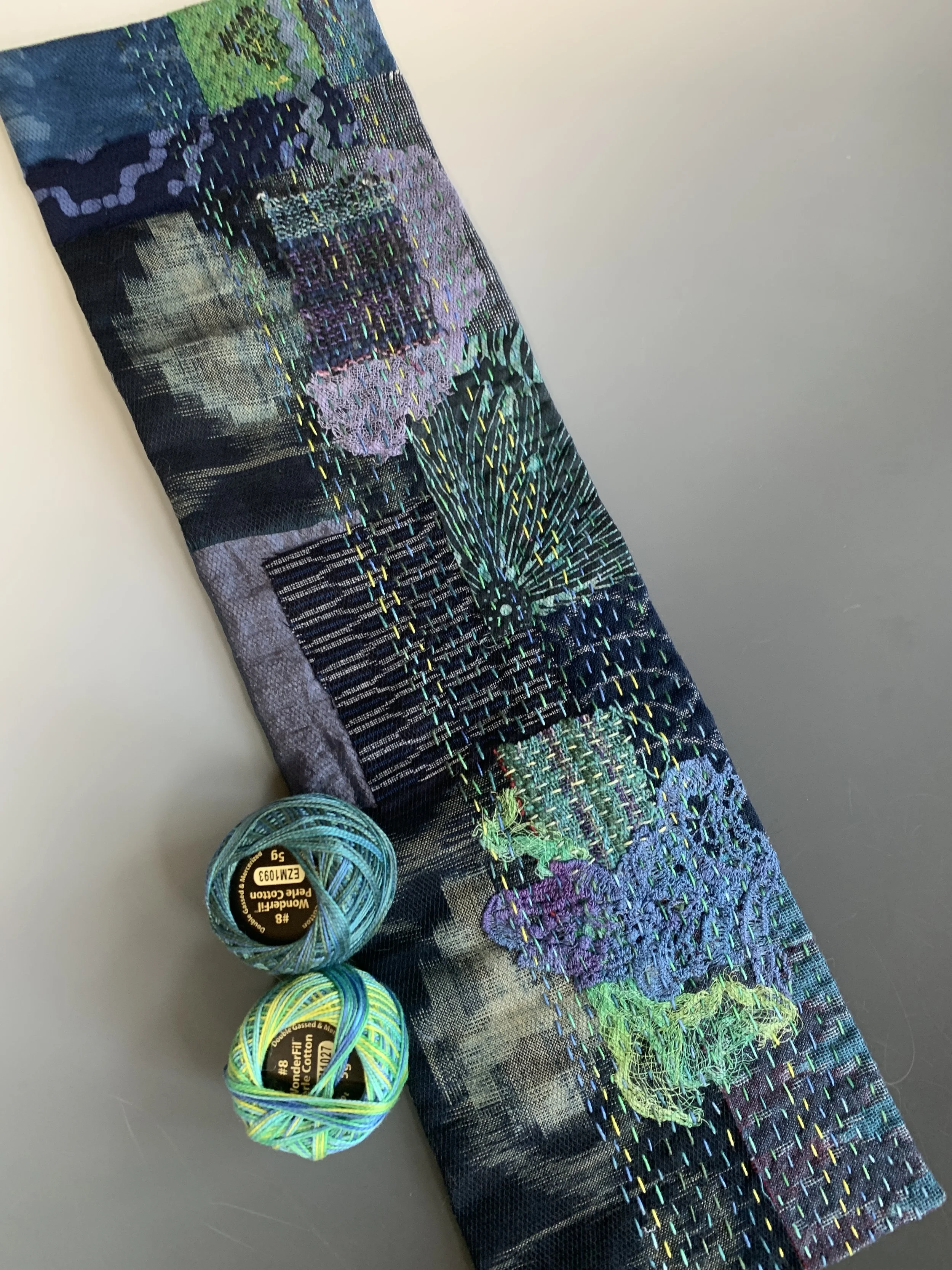 Ice-dyed fabric, handwoven scraps, and sari silks became part of my next Sashiko patch. There is some wabi-sabi nature to it. As some of my handwoven is above the tulle, but most is underneath. The sari silk was used at the borders and created a little differential draw-in after stitching.