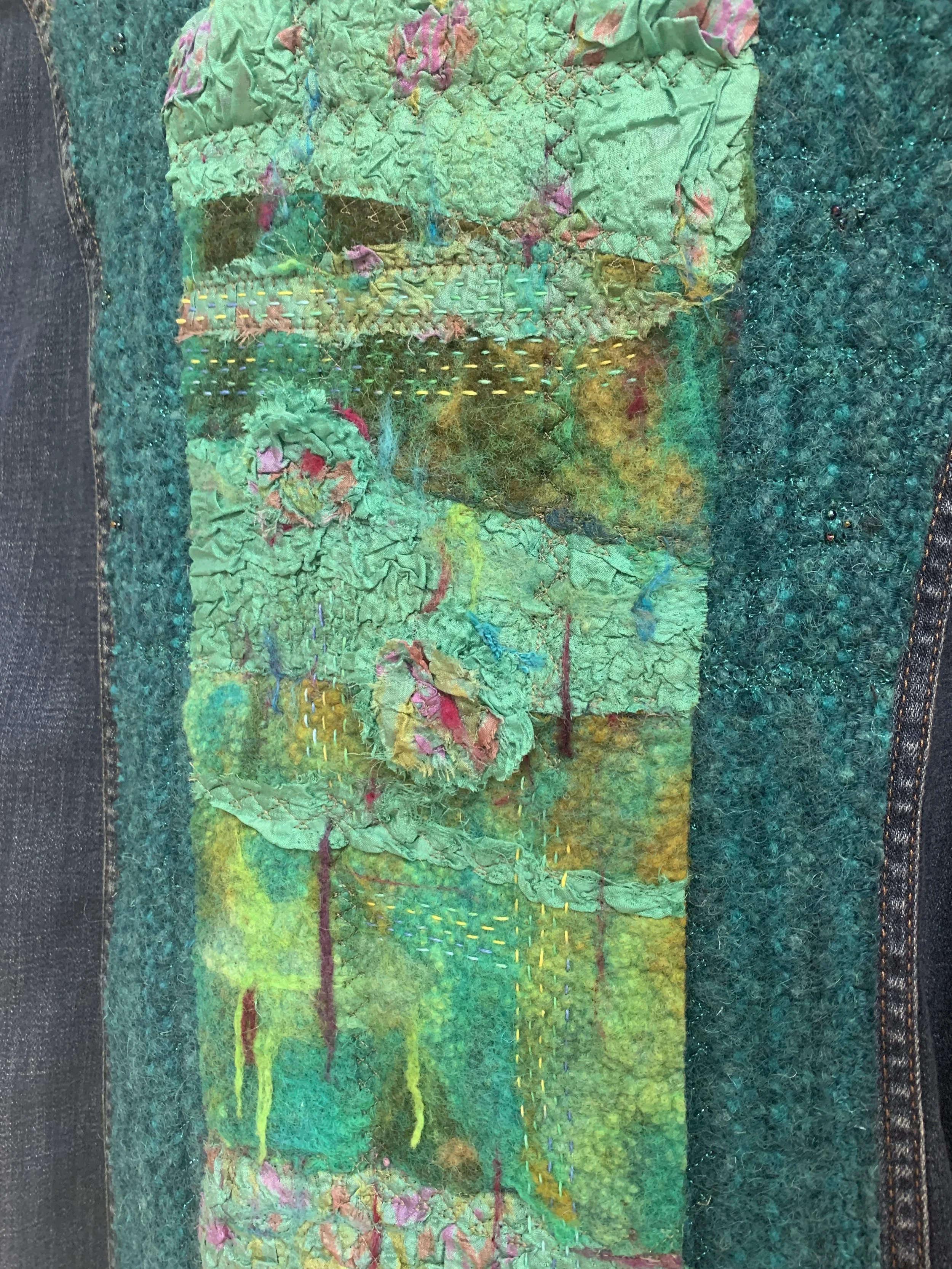 Of course I also became interested in using in nuno felting to further stabilize the cloth as well as add to the design element.