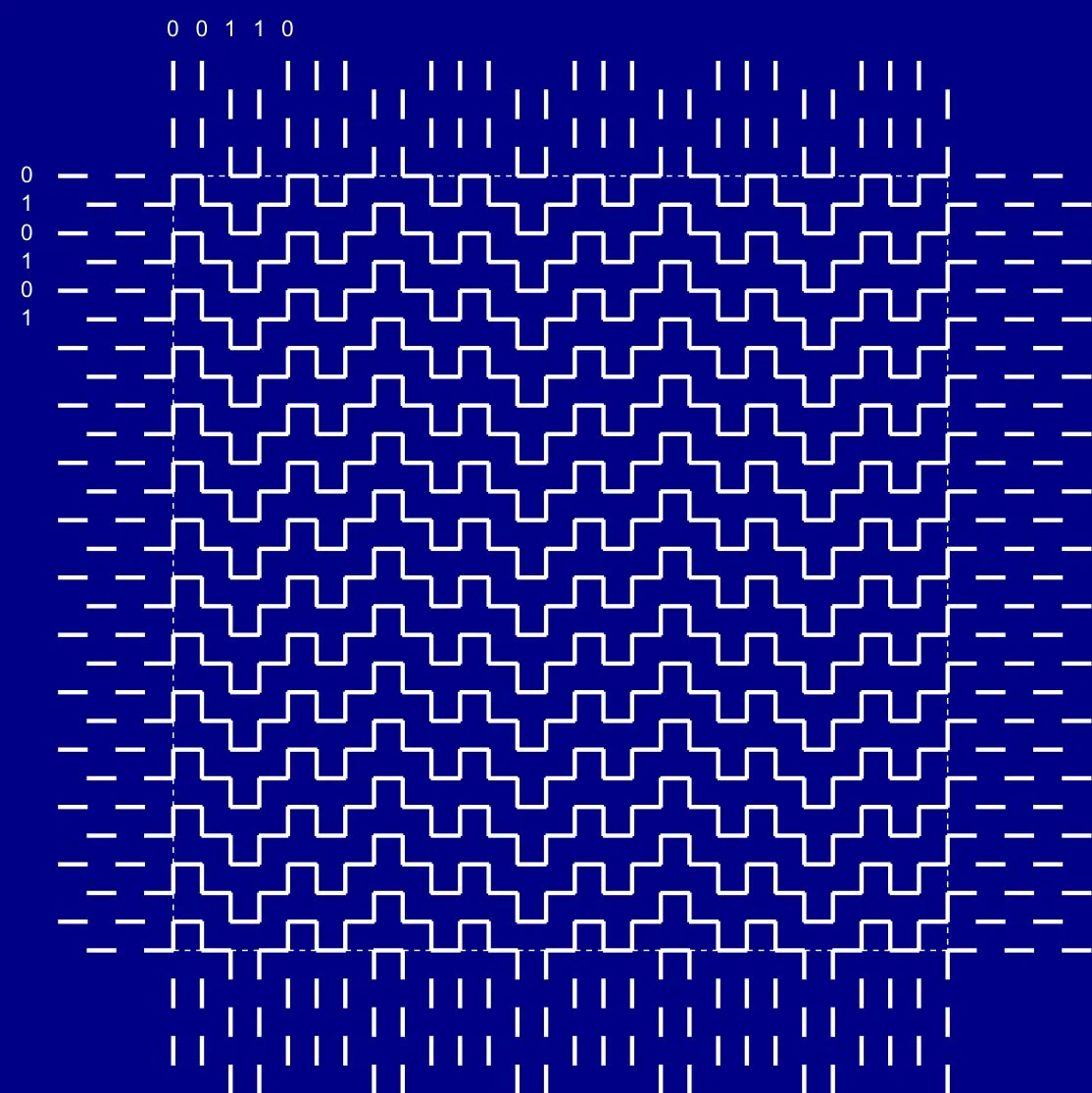 It can be helpful to draw more intricate designs on graph paper. Another useful tool is the Sashiko Pattern Generator by Forest O and Beth Ross Johnson. The pattern generator can be used for Sashiko Ori (Weaving). I have used the pattern generator to create “steps and stairs” to explore how it works. As mentioned, it is designed for weaving.