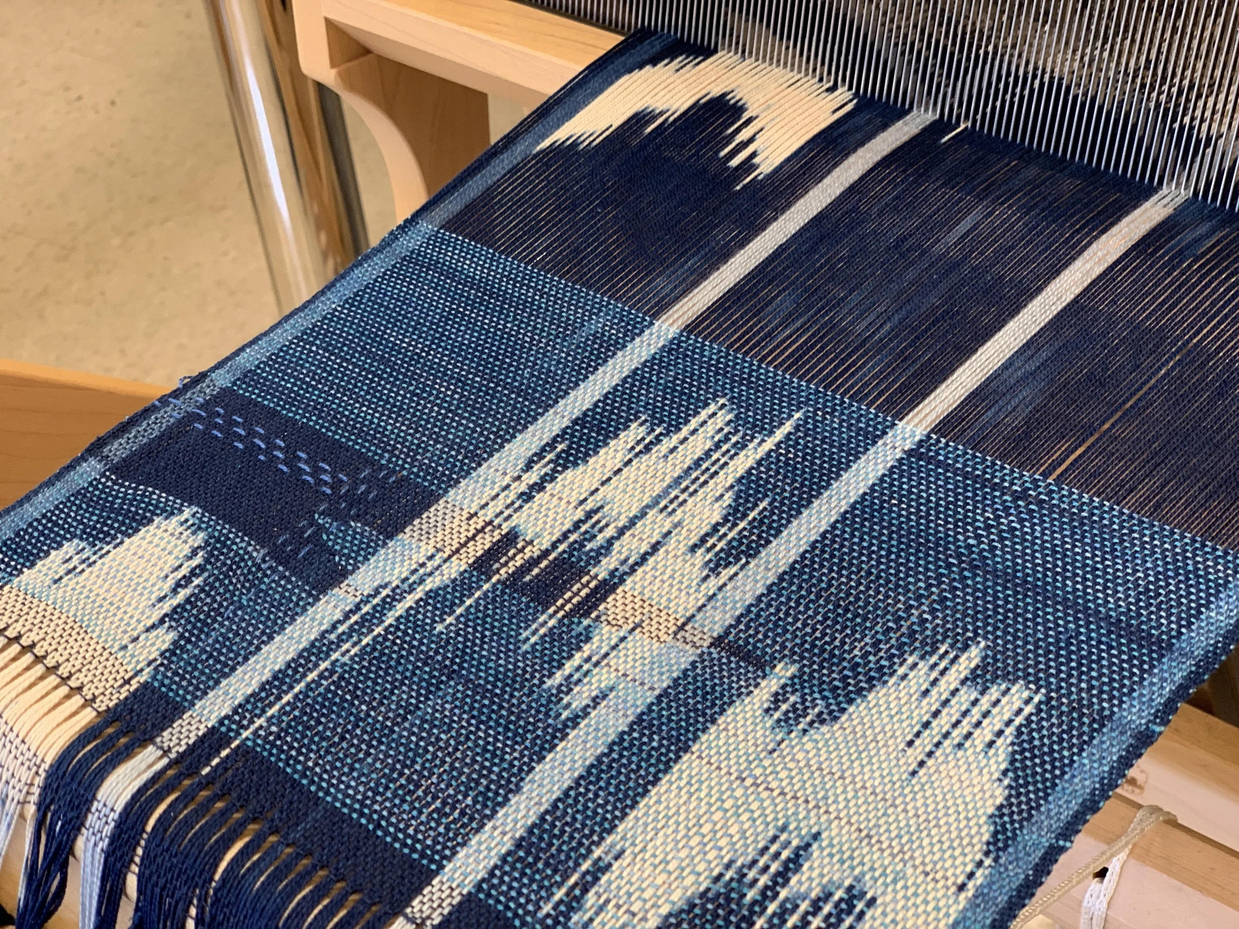 There are over 100 patterns of Sashiko patterns. I have incorporated a variation of “Steps and Weaves” or Dan tsunagi (linked steps) on top of my handwoven remnants. Plain weave cloth makes it easy to see a pattern grid when stitching free form. When continual steps are repeated and spaces are filled, a pattern called “Yamagata” or mountain steps is created. This is my variation or version of it.