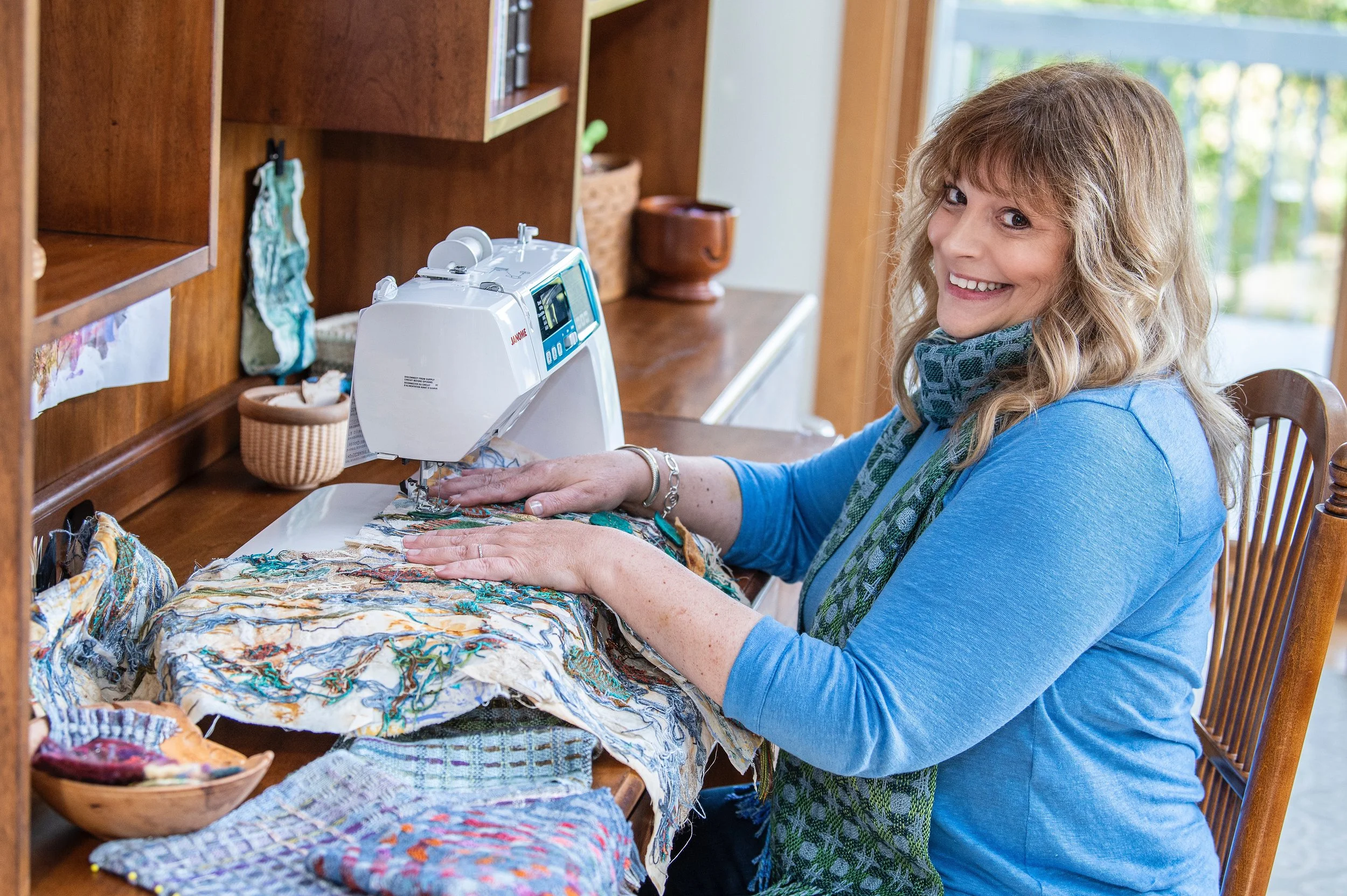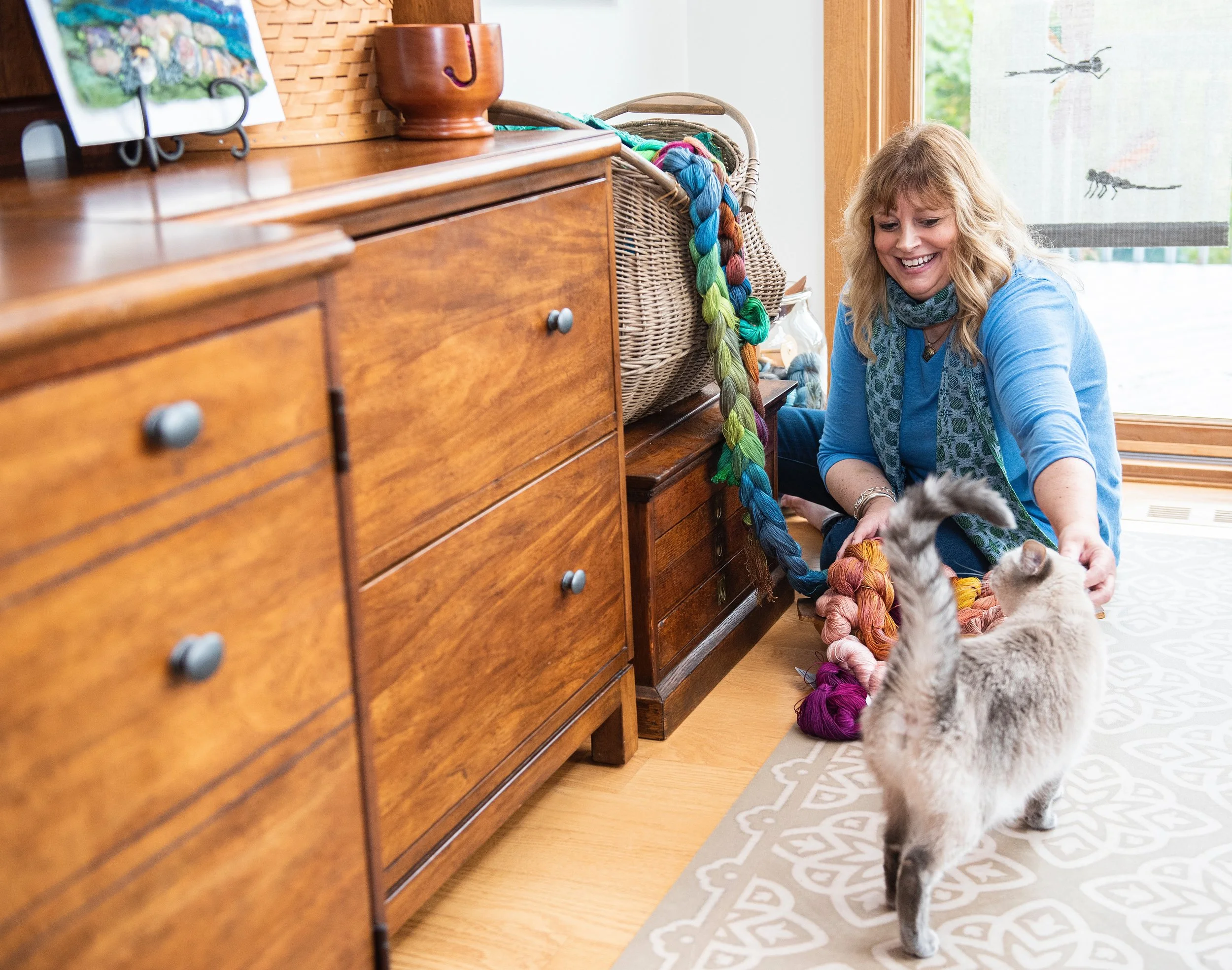 I spend daily time in my studio weaving, sewing, or teaching classes by zoom. It’s surrounded by textile art and I can look out at the natural habitat wetlands of Marsh Lake. Even with window tinting, the sun can become overpowering on bright days. A purchase last fall of a dragonfly window transparency woven by Inger Seitz was a definite need as it keeps the overpowering light filtered. The biggest challenge is yarn storage space! My drawers are packed full of yarn! My favorite item is an old oak antique tool chest! It holds my shuttles and wound bobbin stash. What studio is not complete without a cat?! Leia comes to visit me each day.