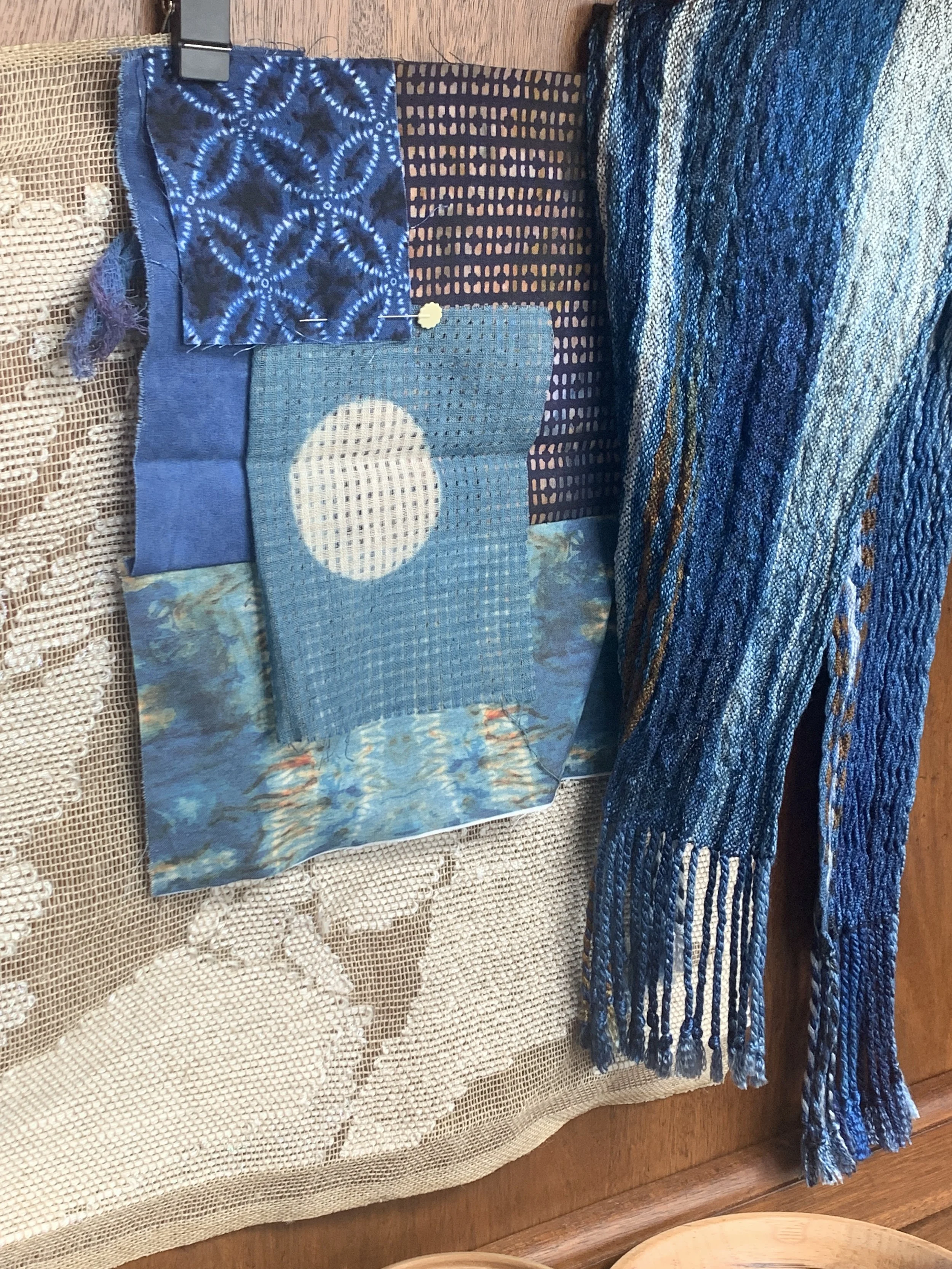 August 2023 I really struggle with keeping my studio organized as it is such a small space. My fiber art interests continue to evolve so I have found it best to organize my desk space by color palettes with recent projects. I spent some time laying out new palettes of indigo fabric collage and ice dyed yarn today. I can’t display all projects or yarns at once, but added some more command hooks to display some recent ice dyed yarn and latest woven shibori.