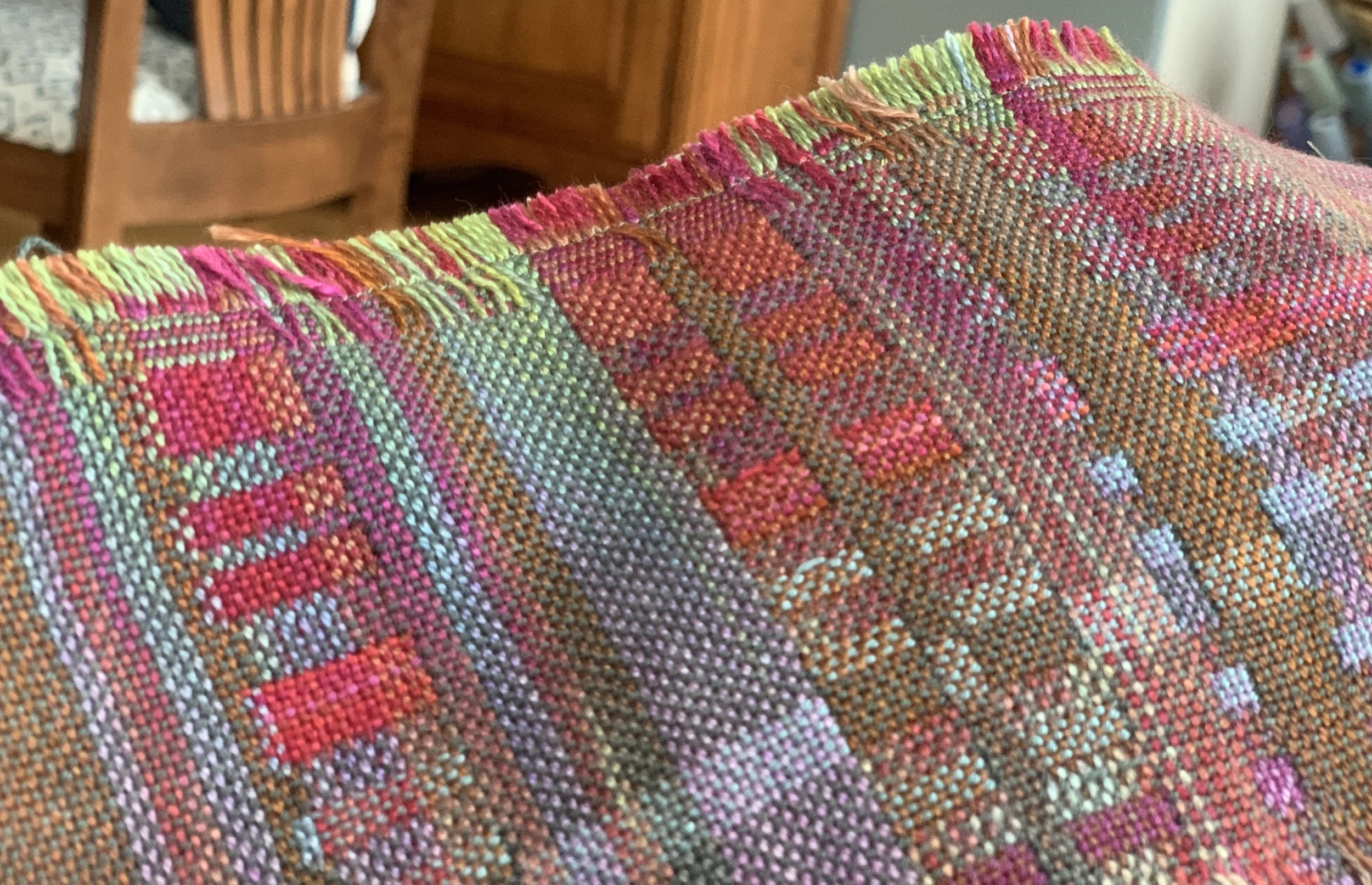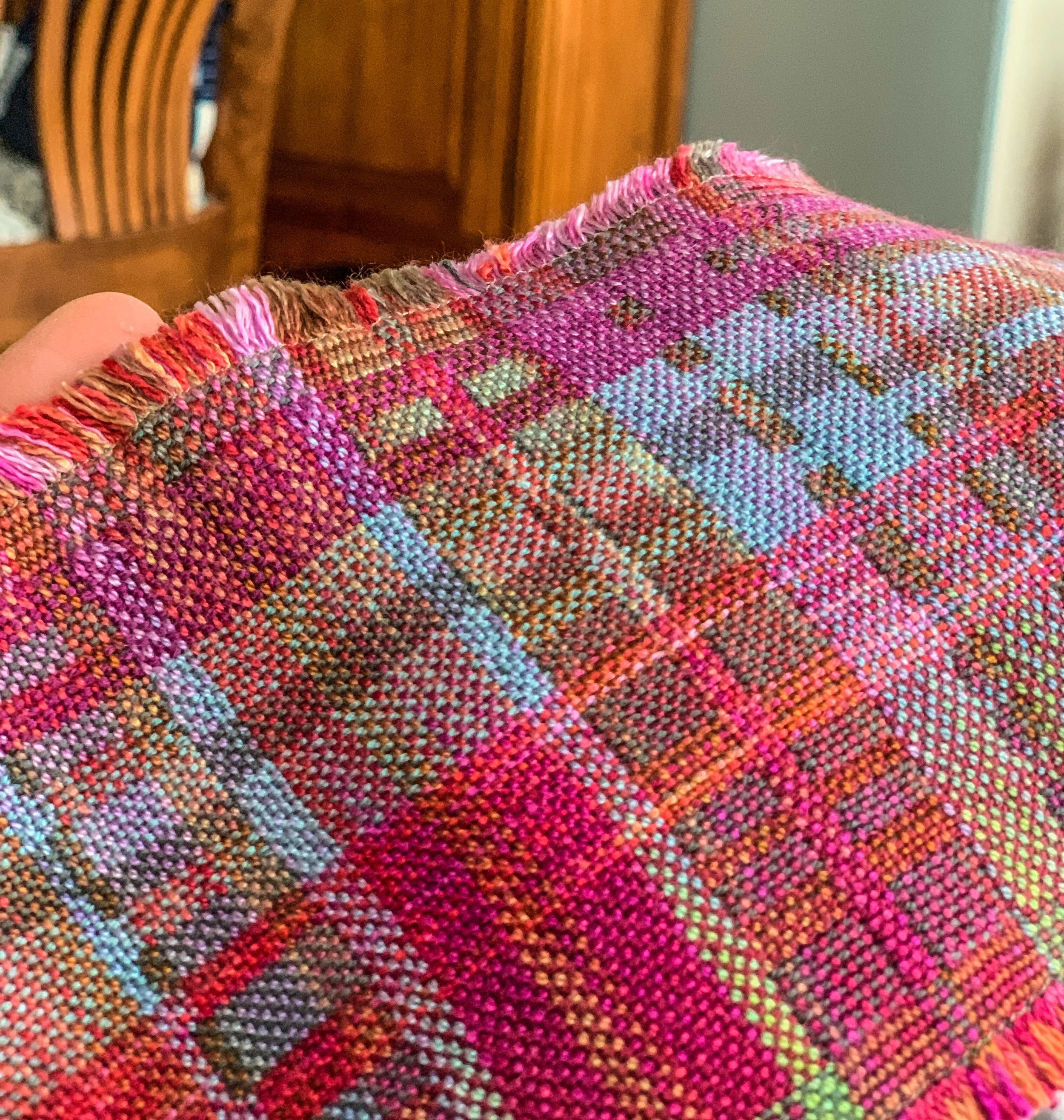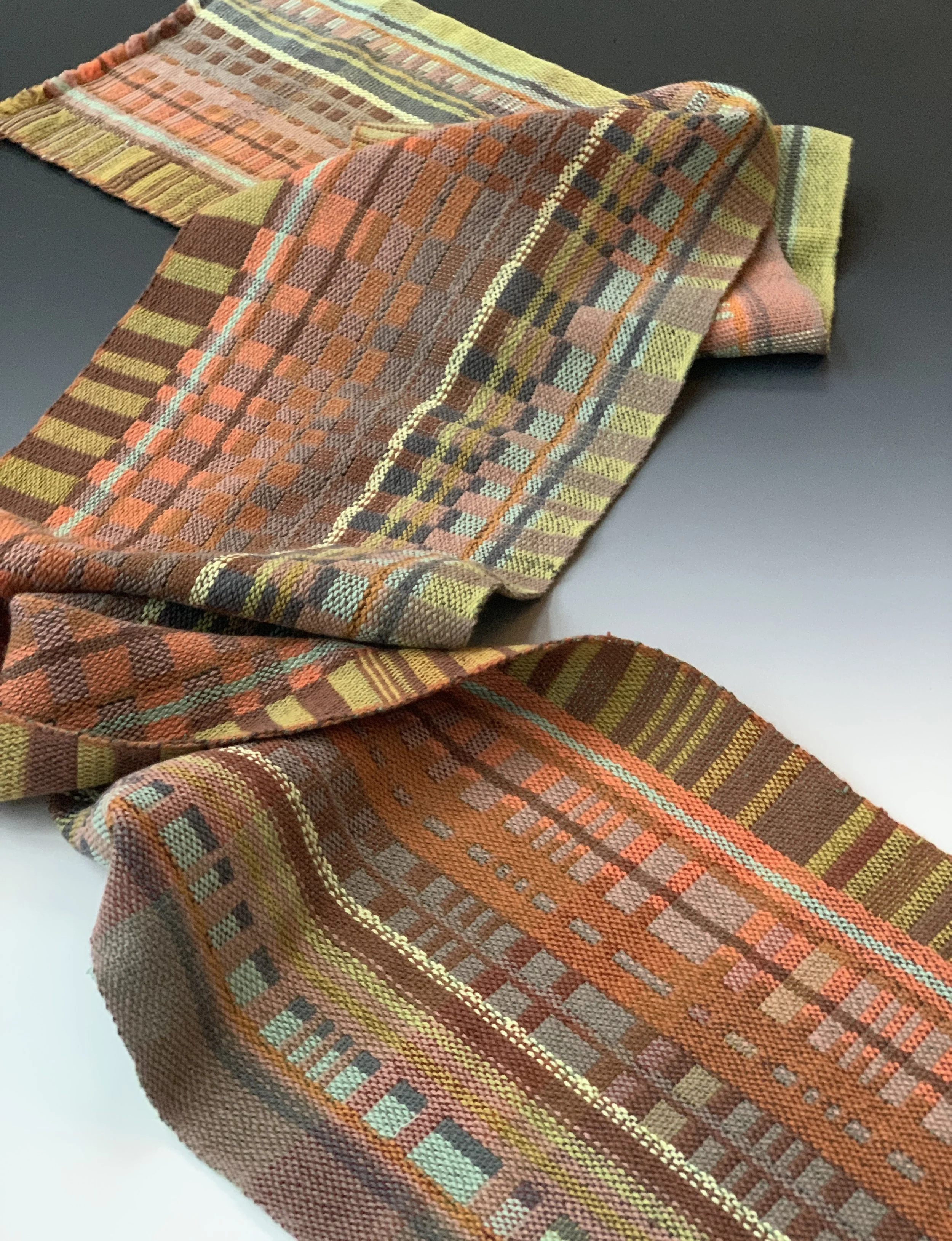 As mentioned in my previous blog, “Name Block Designs, Checkerboards, and More Deflected Doubleweave”, the block threading draft used the name of my Grandmother, Phoebe. For my own continual learning and weaving, I decided to design a new doubleweave one layer at a time by designing in the reed and tieing on to the pre-existing name draft Phoebe threading. I used three different painted warps by Kathrin Weber: Earth Rainbow, Tin Roof, and Tropical Breeze. To separate the layers, I simply raised my plain weave shaft and tied a cord around the length of the reed between the face and back of the warp ends. I tied on the bottom layer first using mostly Earth Rainbow and Tin Roof. I wanted this layer to be earthy/rusty. The top layer had more ends of Tropical Breeze Tencel, the lightest and brightest in color value of the three warps. There were also small striped sections of 4 ends where the ends on the back and front of the cloth were planned with the same painted warp.