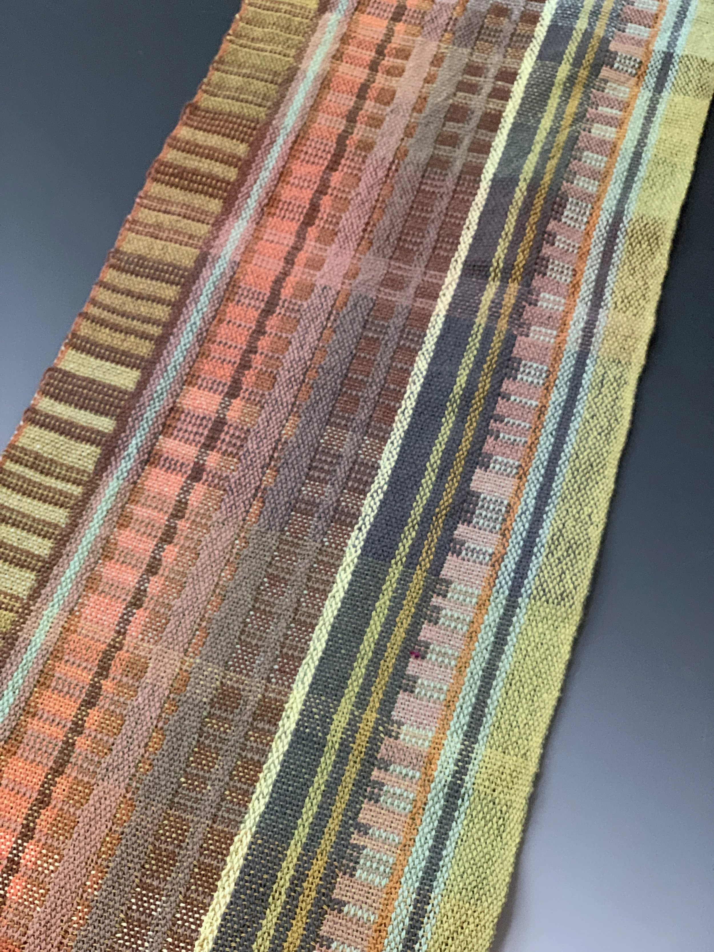 Washed Sample Study: Will think on if I want to replace 4 warp ends with Whipple blue. Also, will plan to introduce some coral weft when the painted warp advances.
