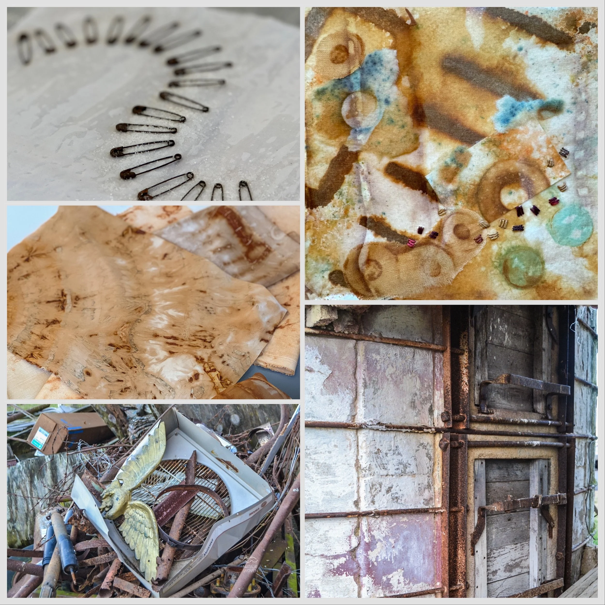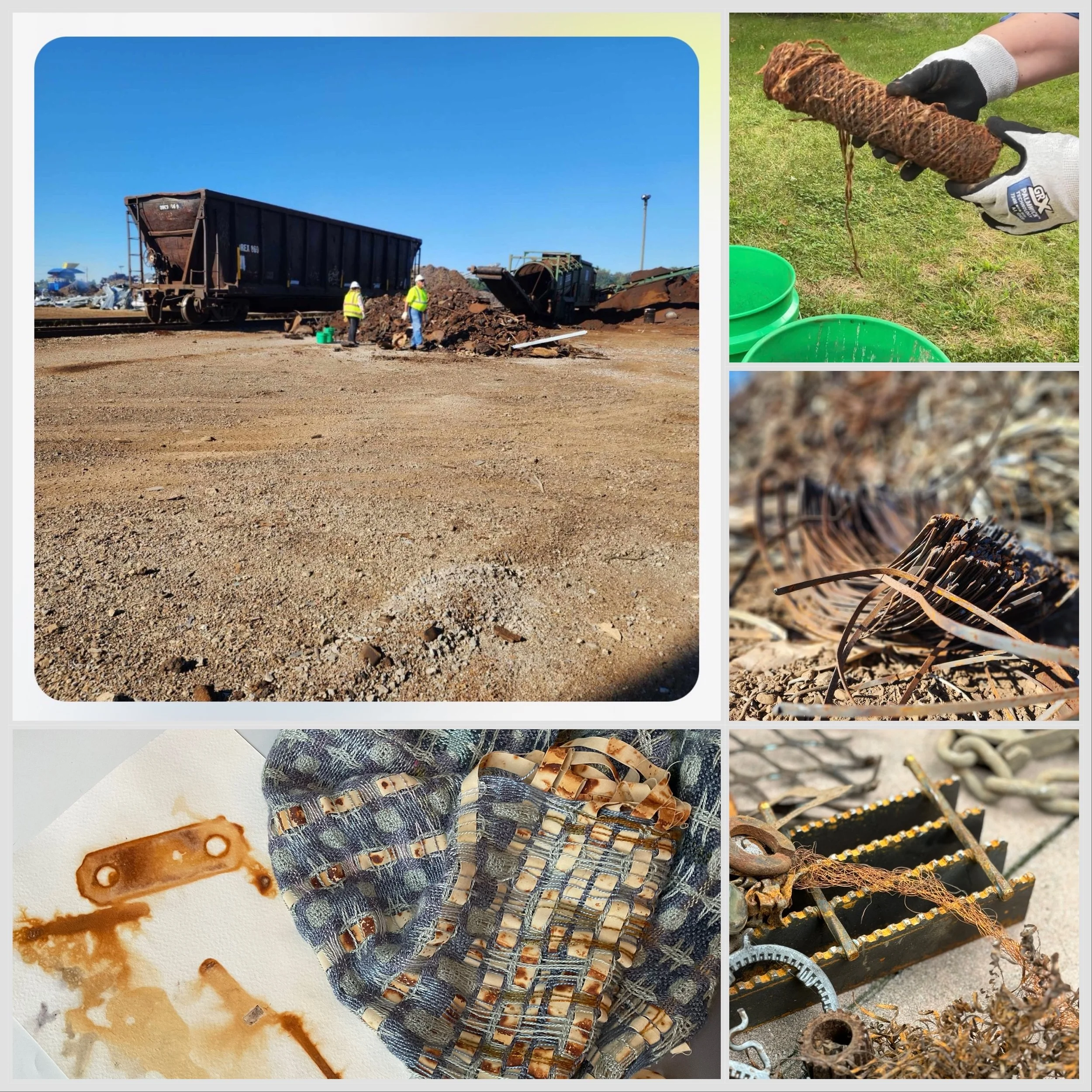 A visit to a local scrapyard now a recycling plant in Waterloo, Indiana with local artist, Sherry Schroeder and her husband Dave provided a lot of my initial rusting pieces and I have now become a collector of rusty pieces. Official rust gear was needed as well! And I didn’t quite expect to find yarn, but I picked up some rusted industrial fiber. My life-long friend, Mary Hardy added to my rusted object collection and visits to Virginia ended up in rust printing exploration. Here are some of the rust pieces along with my initial rusting on paper. Rusting is easy using a spray bottle with 2 parts vinegar to 1 part water and Salt applied in the wetted out stage.