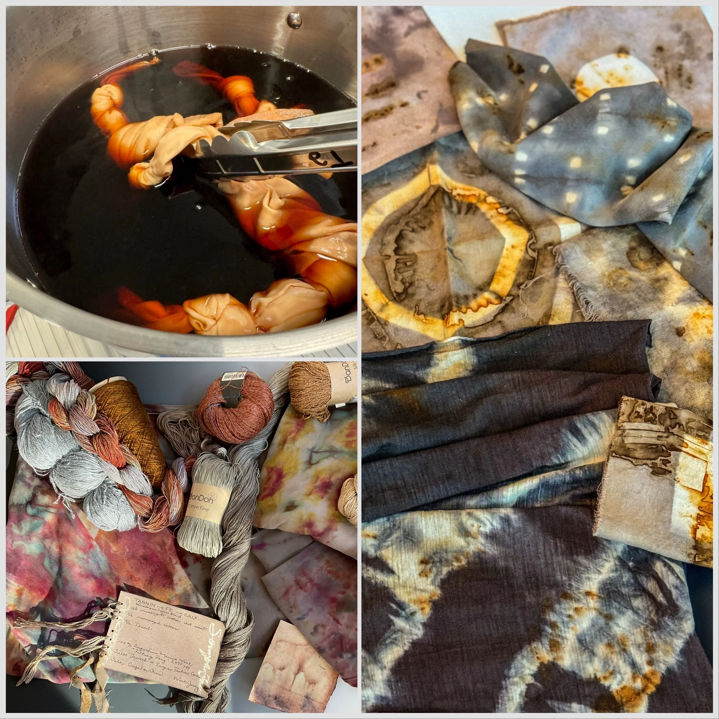 Dyeing fabric and yarn samples happens simultaneously when I prepare the baths. The first fabrics (no rust) I use and put into the dye bath have been scoured with synthrapol or Orvus with various resists so I can have some natural colors of browns, taupes, and grays. Next come the pieces that have been rusted with and without resists (right photo). Shibori resist techniques have been reviewed in earlier blogs and shared to the Fiber Art Blogs Facebook Group. And last come the fabric and previously ice dyed shirt samples (left bottom). I love how the shirts show the previous color and the idea of blending these techniques takes shape. Some cross contamination is conceivable when combining techniques. I avoid cross contamination as much as possible by using tools that only go in that dye pot even after washing.