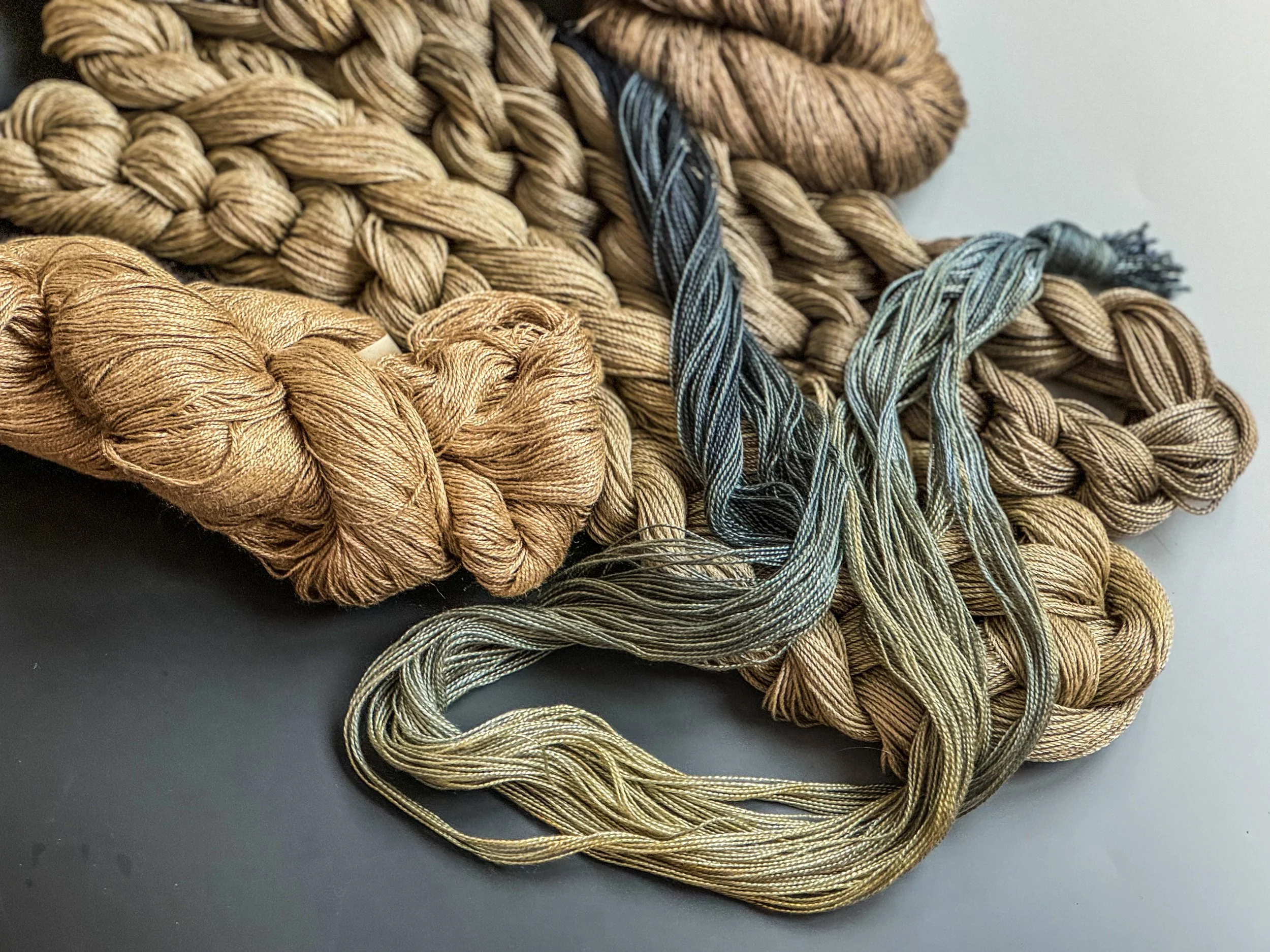Upon return I did some tannin dyeing with pomegranate - 20% Weight of Fiber (WOF). I followed most of the yarns with a quick bath of ferrous sulphate - 1.5% WOF. It’s important to note that iron has impact and will shift the colors of the fiber. Iron and heat can effect the texture making it feel rough. Cellulose fibers work really well with this dyeing process. When using a protein fiber, keeping the ferrous sulphate bath to low temperatures such as 38 degrees Celsius will aide in preserving your yarn. Also, it really only requires a small amount of iron to produce a shift in colors.