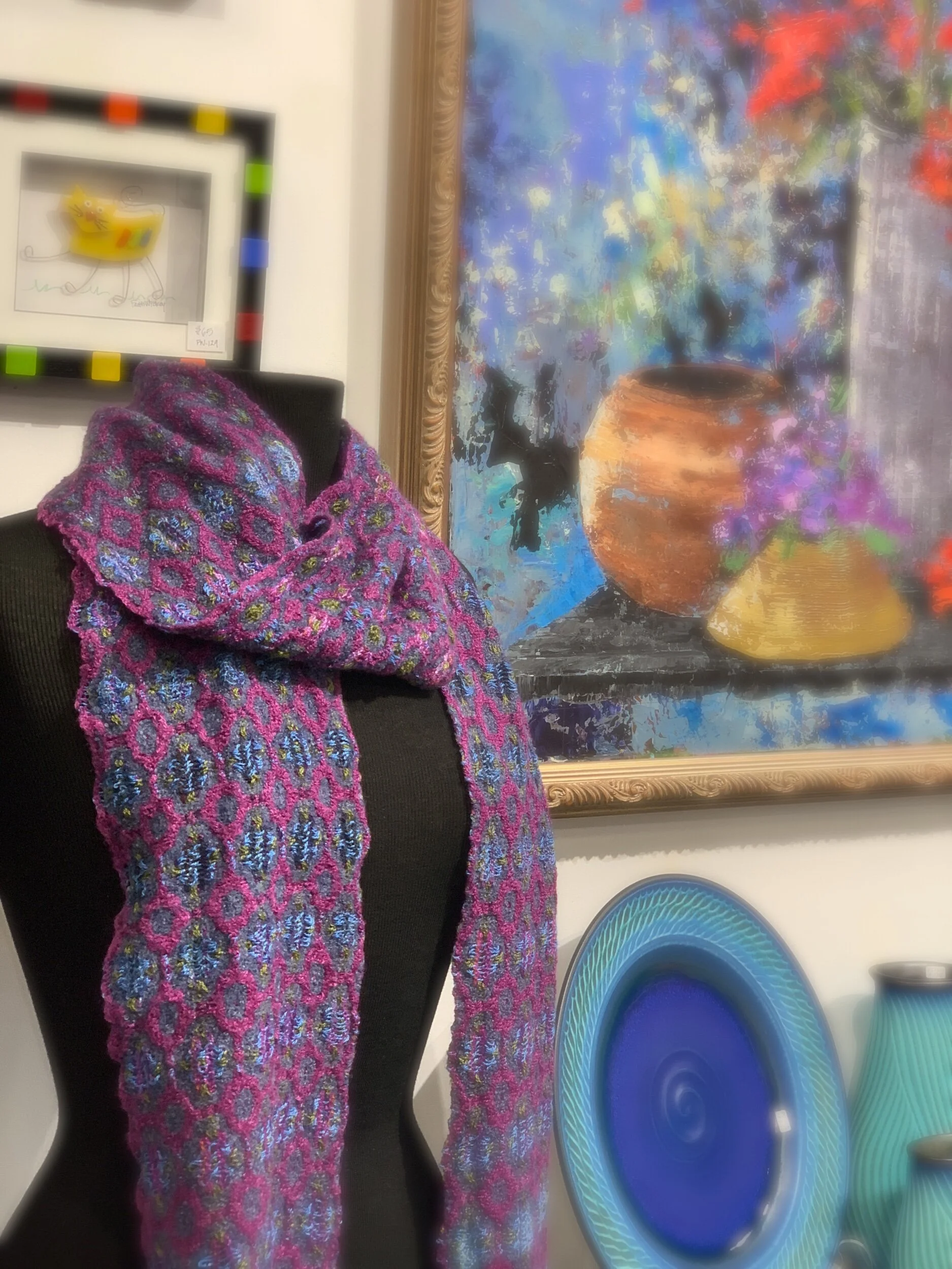 Another experiment with this threading included changing the position of the shrinking fiber, 18/2 curry zephyr. It was woven with two different 5/2 Tencel Blazing Shuttle warps and a rayon boucle’. Of course changing the position of the zephyr and the finishing changed the overall look of the handwoven, but I was pleased with the results. One of my favorite finishes is a hot soak with 2 minute agitation in my top-loader, spin dry, and low heat in dryer, removing when damp.