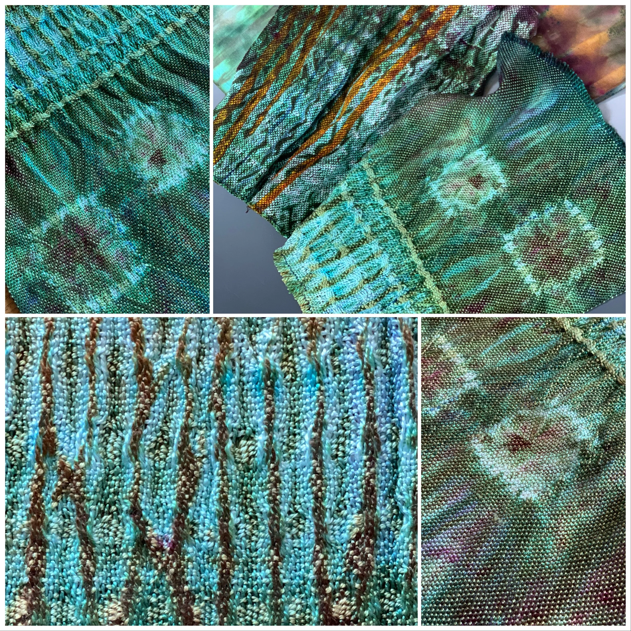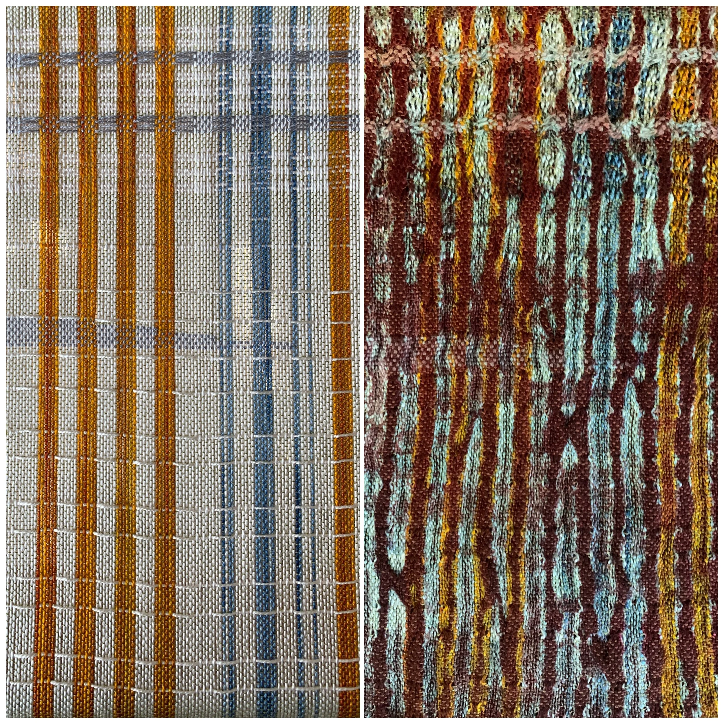Overdying using my ice dye methods as well as cross dyeing became a focus of the study as well. I’ve previously demonstrated cross dyeing using silk and tencel warps in the same dye tub on zoom classes. Both tussah silk and mulberry silk will take the fiber reactive dyes but behave differently resulting in much lighter values than tencel or cotton. I am fascinated by rust dyeing and was attempting to create a rust color palette on the sample above. A variation of this sample treadling at the top led to another experiment.