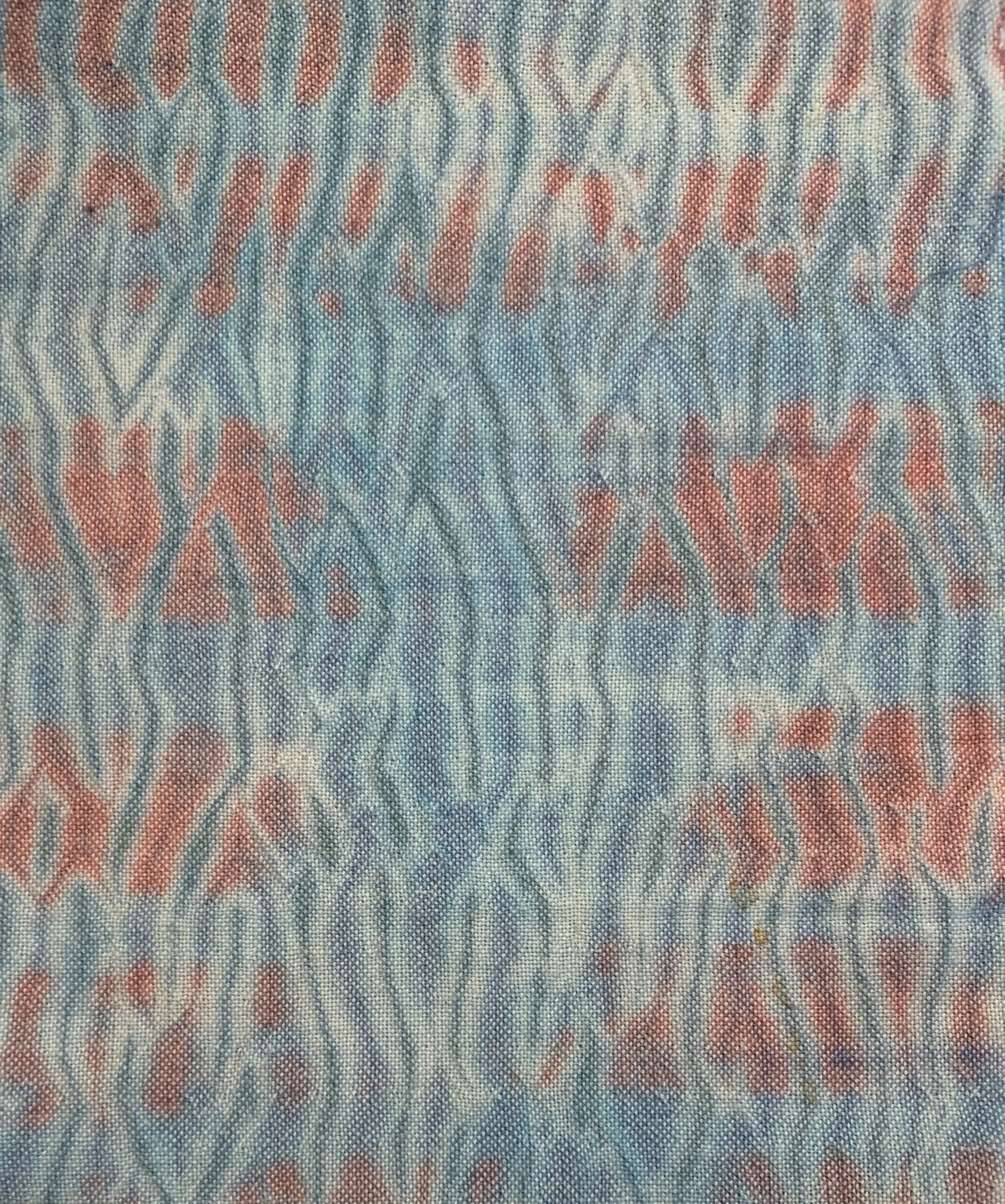 “Woven shibori is a process of weaving and resist” that Catharine Ellis has developed since 1990. The roots of woven shibori lie in a “traditional stitched shibori pattern called mokume, or wood grain”. Stitched shibori uses the running stitch sewn by hand. These stitches are later gathered tightly by hand to create folds which serve as a resist. Nui Shibori is one of the traditional Japanese resist dye techniques. Designs may appear light and dark across the fabric. In 2017, I had my first experience in creating Nui Shibori to produce mokume using a woven blank.