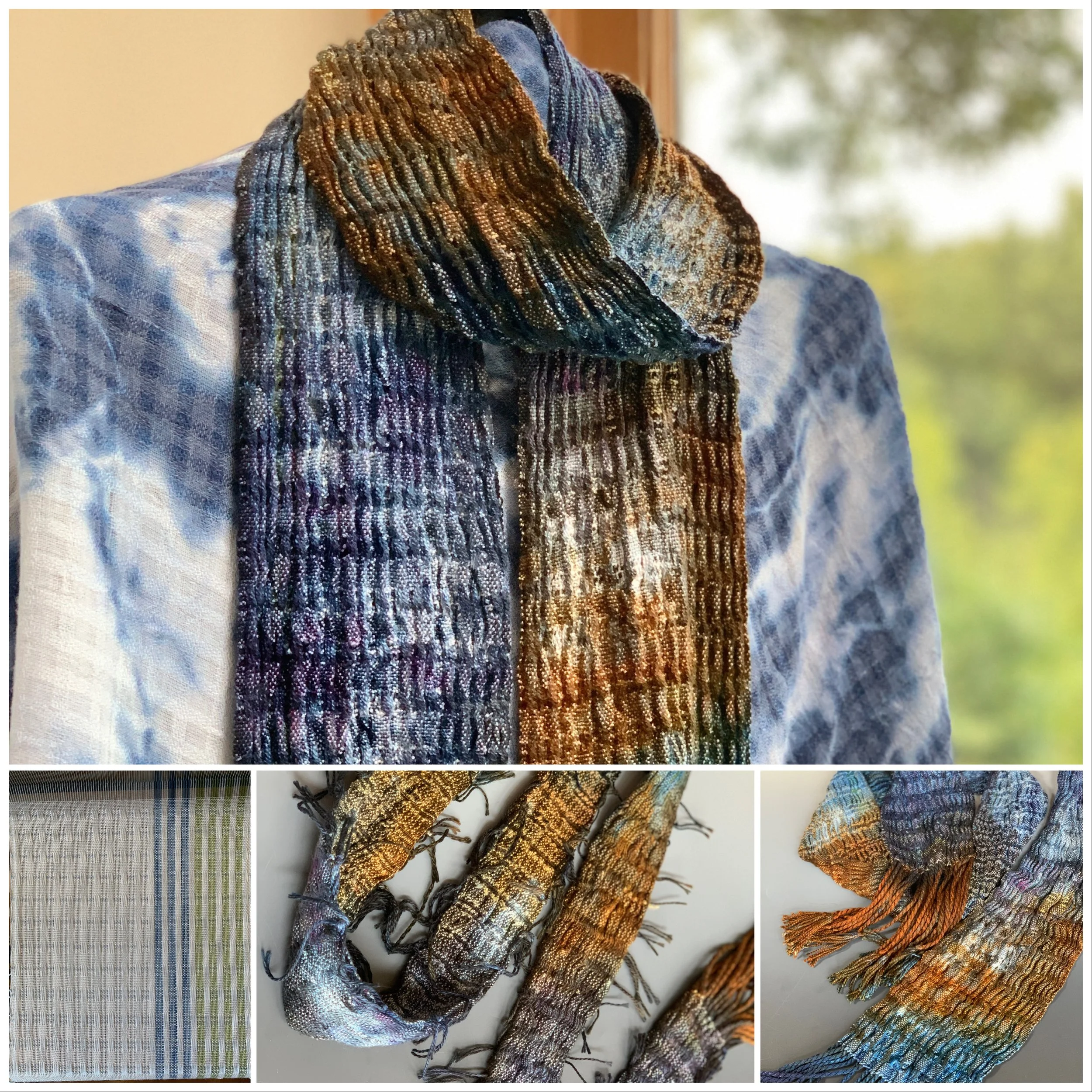 After visiting Catharine Ellis’ studio last year and reading her book Woven Shibori Revised and Updated, I fell in love with the patterns left behind on the woven cloth. Surface Design on cloth became popular in the late 1960s and early 1970s with tie-dye and batik. It is defined as “the coloring, patterning, structuring and transformation of fabric, fiber, and other materials.” The Dyer’s Art: Ikat, Batik, Plangi (1976) by Jack Lenor and Larson led to the formation of the Surface Design Association. Subsequent reading of Complex Cloth (1996) by Jane Dunnewold and a six week course fueled my further learning and creativity with surface design on fabric. Resist dyeing is all about creating surface design in your weaving!
